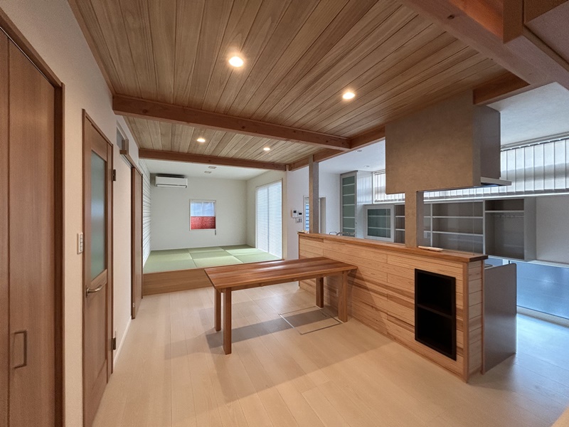 キッチンカウンターの柱は構造上外せないものだった為、内装のアクセントに!